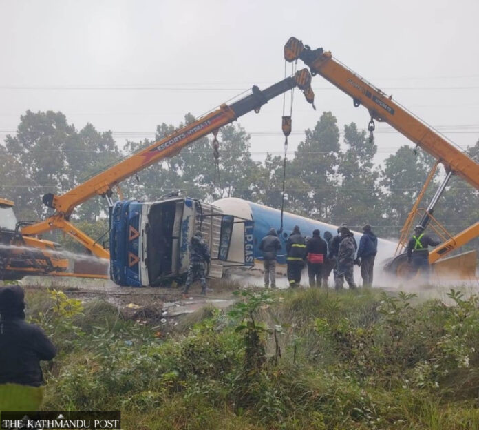 A gas tanker coming from India overturned on the East-West highway on Tuesday morning, blocking traffic for 24 hours. Authorities finally cleared the road and reopened it by 7:30am on Wednesday, the traffic police office in Rautahat said.