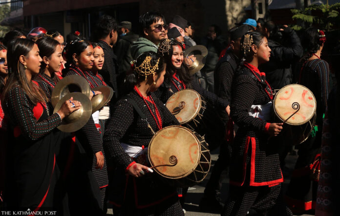 Members of the Newa community take out a procession through the streets of old Kathmandu on Thursday to mark Yamari Punhi. On this full-moon day, yamari, a sweet made from newly harvested rice flour, is offered to the gods and then eaten. Across the country, various communities celebrated Dhanya Purnima, Udhauli, and Dewali,which involves worship of clan gods.